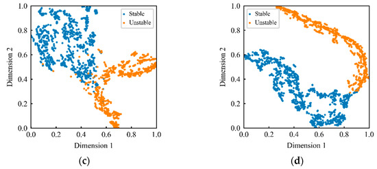 In the actual dynamic monitoring of the power system, the real-time measurement data transmitted by PMUs to the dispatching and communication center is continuously accumulated, which contains a wealth of dynamic trajectory information of the power grid. Based on the recursive structure of LSTM, a sliding time window is constructed to select the sub-sequences of the real-time disturbed trajectory measurements as the inputs of the classifier, which can realize the continuous hierarchical assessment process. As shown in Figure 3, it is the active power output data set obtained from generator 30 in the New England 39-bus system under various load levels. Figure 3a,b respectively correspond to the distribution of data in stable and unstable conditions under different response times, and the data have been normalized.