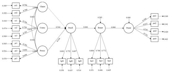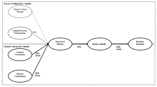 The SEM analysis indicated that both H2a and H2b were significant, suggesting that both channel process consistency and channel content consistency have positive and significant influences on perceived channel fluency. The average factor loadings were 0.730 and 0.707, respectively, and < 0.001. Perceived fluency (H3b) through channel integration quality was also statistically significant and had a positive influence on brand attitude. Finally, brand attitude (H4b) fully mediated the relationship between perceived fluency and purchase intention. Figure 1 shows each measurement item. Figure 2 shows the final model.