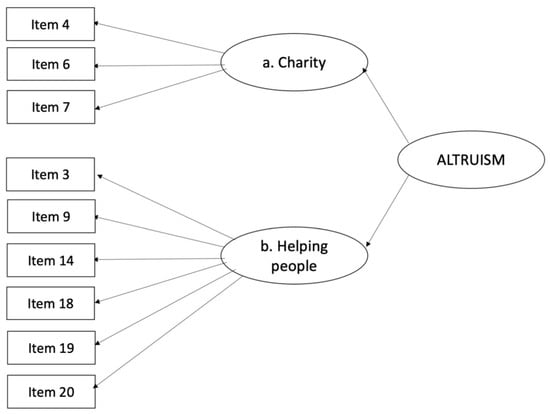 - Second order two factor model (Model E, see Figure 1), where a second order factor contains the whole altruism domain [70].