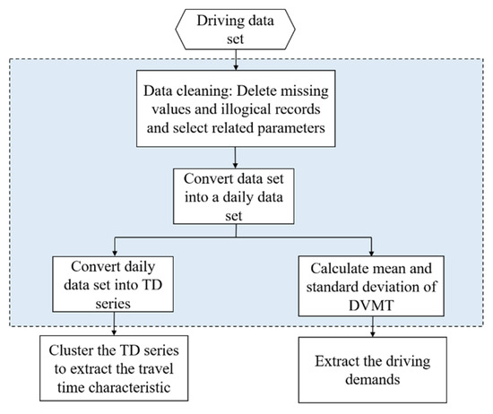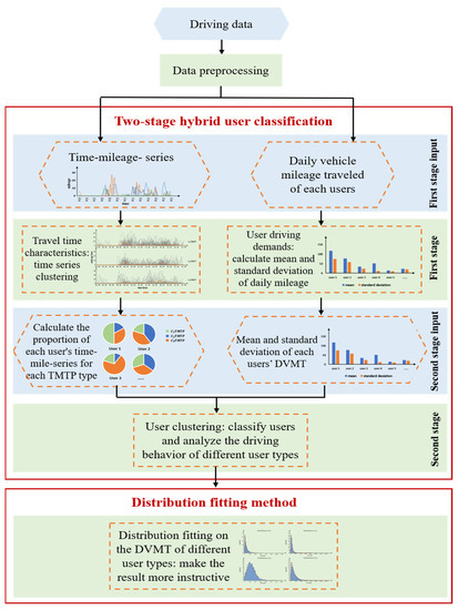 There are two main methods used in study: (1) a two-stage hybrid user classification and (2) distribution fitting. The two-stage hybrid user classification method is to better describe the driving behavior of different users, which consists of two stages: (1) extracting user driving time characteristics and driving demands and (2) user clustering. The first stage analyzes the driving time and vehicle mileage to perform time-series clustering. This determines the typical daily time–mileage travel patterns (TMTP) and calculates the mean and standard deviation of DVMT of each user to reflect the overall driving demand trends. The second stage classifies users and analyzes the driving behavior of different user groups. After the two-stage hybrid user classification method, the distribution fitting method is performed using a distribution function to fit the DVMT of different user types. The method of our study effectively describes and explains the driving behavior characteristics of different user groups, with highly instructive results.