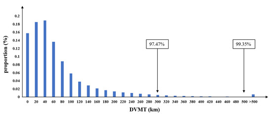 Table 1 describes the data set and indicates that the DVMT of the 1000 vehicles varies significantly, ranging from 0 to 1506 km. The average DVMT is 63.498 km. The fourth column of Table 1 shows that the data set covers a total of 76.12% active days from April 2020 to December 2020. In addition, Figure 2 shows that only 0.65% of the DVMT values extend beyond 500 km, whereas most DVMT values, 97.47%, are within 300 km.