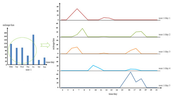 In addition, Figure 5 shows that one user had significant diversity in vehicle use, with travel patterns changing on different days. The figure shows the different time–mileage-series patterns of User 1 over a 5-day period (weekdays).