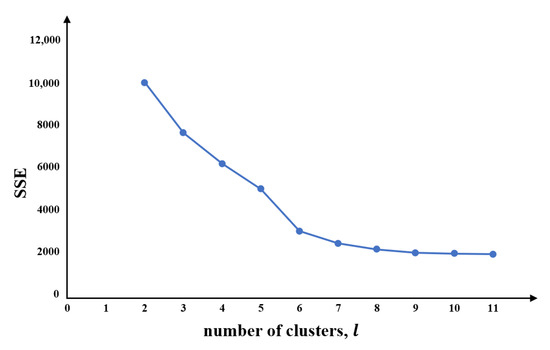 This means that the series are divided into six typical daily time–mileage driving patterns (). The sum of the squared errors (SSE) is the core index of the elbow method.