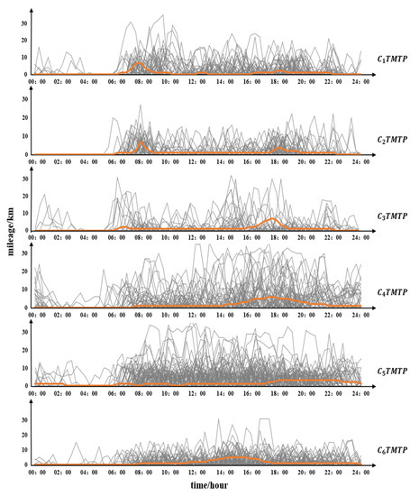 After time series clustering, we randomly selected 100 mileage change patterns from each TMTP types to show the characteristics of different TMTP types, shown in Figure 7. The orange line is the center of the cluster for different TMTP types. The cluster indicates that driving time is mostly concentrated between 7:00–9:00 and 18:00–20:00, with a small concentration at 12:00–13:00. User types can be inferred based on their driving time patterns [3,39]. As such, the driving pattern may reflect the driving behavior of household members going to work and picking up students. The small peak at noon may reflect a drive for lunch. There are two peaks for , at 7:00–9:00 and 17:00–19:00. These correspond to office worker commuting times. For , the DVMT is zero most of the day, indicating infrequent vehicle use. The peaks are at 6:00–7:00 and 16:00–18:00, and the driving distance per unit of time is larger in the afternoon. This may indicate travel patterns for users who use their vehicles infrequently.