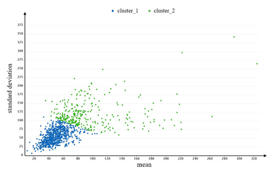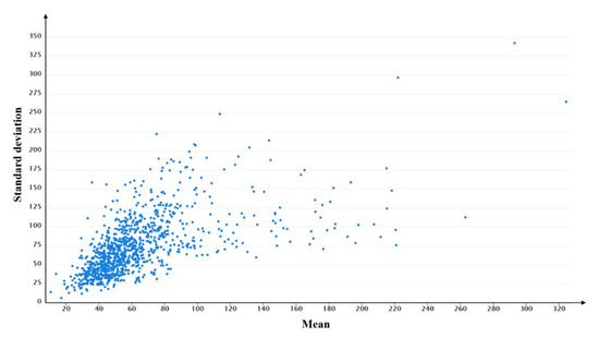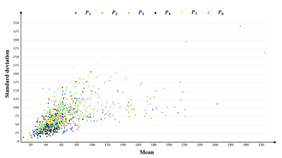 The mean and standard deviation are calculated to show the travel demands and overall tendency of users. Figure 8 shows the distributions of the mean and standard deviation of each users’ DVMT. The mean DVMT value for users ranges from 10.754 to 324.377 km, while the standard deviation of DVMT ranges from 6.293 to 341.996 km. In addition, the average mean and average standard deviation of DVMT of all users are 64.018 and 74.583 km, respectively. The large differences between the mean and the standard deviation of each users’ DVMT indicates that travel demands and the regularity of each user are very different.