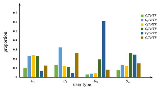 For user set , classified using the MS-cluster method, there is no significant difference in the distribution of the average proportion of different TMTP types between user type and . For , there are only small differences among the proportions of different TMTP types in . The largest proportion among the six TMTP types is , accounting for 29% of the total daily driving patterns. The smallest proportion is seen for , accounting for 5%, while the proportions of other TMTP types are similar, around 15%. For , there are only little differences among the proportion of different TMTP types. The proportions of , , and are around 20%, and the proportions of and are around 15%. In summary, there are no clear daily typical TMTP types in user type and , indicating that the MS-cluster method does not effectively distinguish the driving behavior of different users.