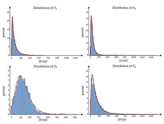 Compared with analyzing the mean and standard deviation of DVMT values, distribution fitting can better explain the driving behavior and have more guiding significance. This is because distribution fitting can display regular user travel patterns and statistically reveal driving habits [25]. Distribution fitting of the DVMT values for different user types can be used in a variety of applications, such as better understanding different user driving behavior, analyzing their travel needs, and providing stronger guidance for the transportation department. Therefore, after obtaining user classes, we performed distribution fitting of the DVMT of these classes.