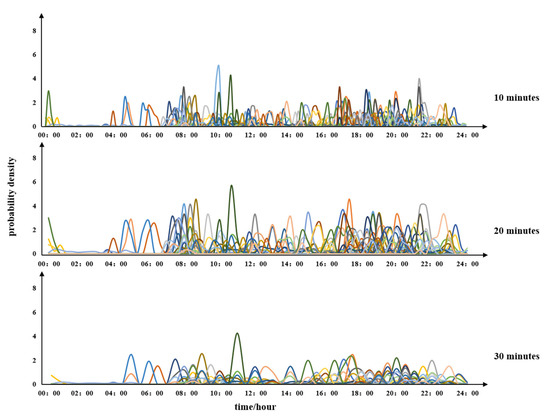 To identify the best time period granularity, three kinds of time durations are assessed (10 min, 20 min, 30 min) to observe the patterns in the time-series changes. Figure A1 shows that the daily vector is converted into time–mileage-series ; 50 series are randomly selected to determine the optimal granularity of the time period duration. The probability density (PD) at time refers to the value that is 10 times the ratio of the driving mileage at to the daily total driving mileage. The characteristics of the series cannot be sufficiently distinguished at a time granularity of 10 min; thus, the typical daily driving patterns (TMTP) cannot be effectively explained. However, a 30 min time period duration is too large, missing smaller duration trips and inadequately reflecting the real user travel patterns. Figure A1 shows that a time period of 20 min performs better, with more interpretable series results. Therefore, 20 min is selected as the recorded value.