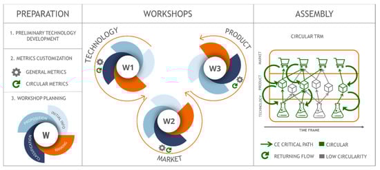 Figure 2 shows the circular TRM divided into three main steps: preparation, workshops, and assembly. The former involves both development of the supporting elements and workshop planning, whereas the second addresses the classification and ranking of the technologies, products, and markets, according to general and circular aspects. The latter gathers the final roadmapping and identifies the better-ranked circular options.