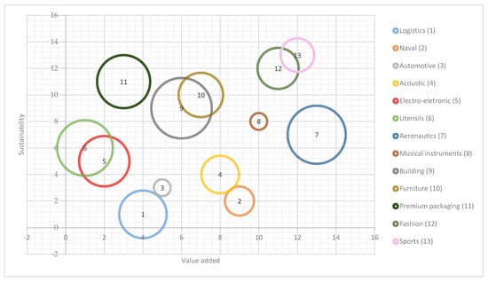 Figure 3 shows a bubble chart ranking, where the bubble size represents the market size metric. Furthermore, participants distributed markets on the vertical axis according to the perceived appeal of sustainable solutions, and on the horizontal axis according to the perceived value of the solutions. Particularly in this step, sustainability replaced circularity. Sustainability appeal represents the way the participants considered the markets would respond to more sustainable solutions. Therefore, the higher the sustainability appeal score, the more sensitive the market is to sustainable solutions and the more likely it is to apply circular materials. This logic considers that most of the circularity rests inside the sustainability field, while sustainability remains a broader concept.