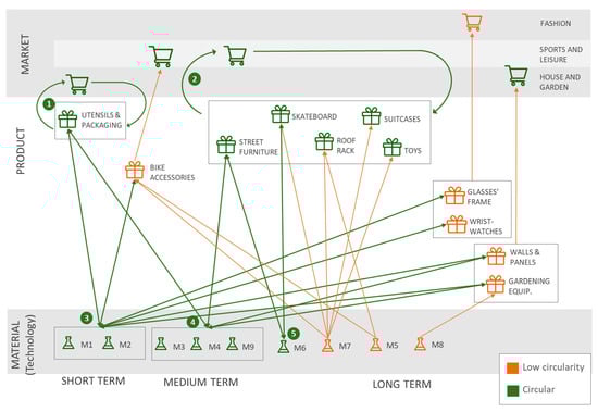Figure 3. For this reason, materials M5, M7, and M8, which have the lowest “recyclability” scores, received the “low circularity” tag. The classification of products as circular also considered the servitization criterion. Arrows 1 and 2 indicate product servitization potential, with products coming back from the market. Similarly, arrows 3, 4, and 5 indicate the recyclability potential of the alternatives, represented by products turning back into material inputs and vice versa.