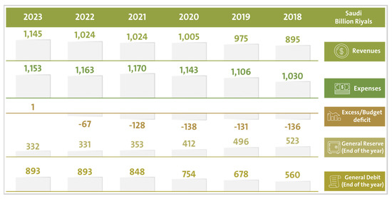 The majority of Saudi Arabia’s economic and financial reforms were formed in order to encourage economic and financial transformation, thereby ensuring that public finances are sustained. By doing so, the economy of the nation will develop and a spending efficiency can be maintained [5]. By the year 2023, it is estimated that the revenue of Saudi Arabia will reach 1.154 billion. The general financial estimates of Saudi Arabia from 2018 to 2023 are shown in Figure 1, below.