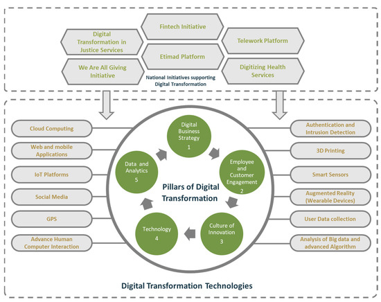 The Saudi Arabian government has come up with several national initiatives, such as the Fintech initiative, telework platform, Etimad Platform, Digitizing Health Service, Digital Transformation in Justice Services, and We Are All Giving Initiative to support digital transformation. Figure 2 presents the various national initiatives of the Saudi Arabian government that support the process of digital transformation [16,17,18].
