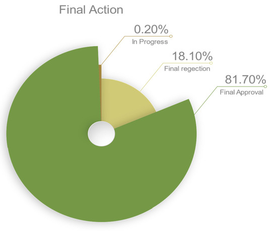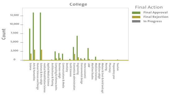 The data collected on student course withdrawal over a duration of 3 years show that 81.71% of the applications submitted by students in electronic format—irrespective of their gender—were accepted, while only 18.10% of the applications were rejected. These results were analyzed from different viewpoints, e.g., by students, academic guides, vice-deans and deanships. The results of the statistical analysis are presented in Figure 3.