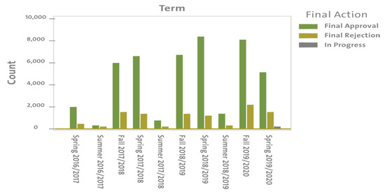 From the data collected from the university, it was observed that the majority of student course withdrawals (8713) occurred during the spring of 2018 and 2019. The above-identified statistics are represented in graph form as shown in Figure 4.