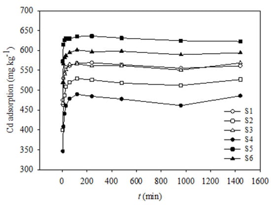 Figure 1 shows the results of the Cd(II) adsorption kinetics experiments with increasing time, from 5 to 1440 min. The shapes of the Cd(II) adsorption simulation curves corresponding to the six soil samples were similar; however, their adsorption capacities were significantly different, except for those of S1 and S3. The adsorption amounts of Cd(II) in all the soil samples increased remarkably within the first 30 min; however, after 60 min, the Cd(II) adsorption amounts corresponding to all six soil samples reached a plateau. Therefore, the Cd(II) adsorption process can be divided into rapid and slow stages, and the turning point appeared at 30–60 min.
