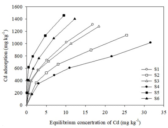 The adsorption isotherms for the adsorption of cadmium onto the six soil samples are shown in Figure 3. From the isotherm curves, the cadmium adsorption capacity of each soil sample increased as the equilibrium solute concentration increased. At low equilibrium concentrations, the Cd adsorption amount increased almost linearly, and, at high equilibrium concentrations, it tended to flatten; however, there were differences among the six soil samples. Sample S5 showed the maximum Cd adsorption amount, followed by S6 > S1 > S3 > S2 > S4.