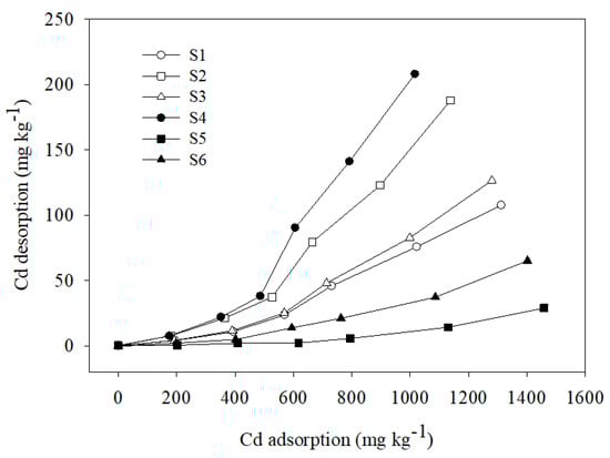 The results of Cd(II) desorption from the six soil samples (Figure 4) showed that Cd(II) desorption from the soil samples increased significantly as the Cd(II) adsorption amount increased. Thus, Cd desorption was related to the adsorption process. Specific adsorption decreased as the adsorption amount as well as the exchangeable adsorption amount increased. Thus, an increasing number of ions adsorbed onto low potential energy sites and easily desorbed at high adsorption amounts, leading to an increase in the amount of the adsorbed Cd(II) that desorbed into solution. The Cd(II) desorption amounts were significantly less than the adsorption amounts. This finding is consistent with previous reports [5,27,50,51] and indicates that Cd(II) desorption from the six soil samples was incomplete and only partially reversible.