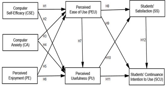 Davis et al. [34] developed the technology approval model (TAM), which measures user acceptance of various technological instruments [35,36]. Furthermore, the computer self-efficacy concept is based on Bandura’s [37] self-efficacy construct and its significance in the social cognitive theory (SCT) [38]. Self-efficacy is defined as a person’s belief in their own ability to do things successfully. Self-efficacy is not a measure of one’s talents or talent in and of itself; rather, it symbolizes what people feel they can do based on their talents or skills. The TAM and SCT were used as the underpinning study framework in this study to address the subject of how university students embrace and utilise digital learning for sustainable development. ICT has revolutionised technology, higher education, teaching and learning. Research has established a variety of complementary and contrasting models for exploring the adoption of information systems (IS), such as ICT. The technology acceptance model (TAM) [39] is the most influential theoretical contribution to the adoption research and it is widely used by scholars to examine technology adoption. In this study, seven factors influencing the adoption of ICT for digital learning as sustainability were examined: computer self-efficacy (CSE), computer anxiety (CA), perceived enjoyment (PE), perceived usefulness (PU), perceived ease of use (PEU), students’ satisfaction (SS) and students’ continuing intention to use (SCU), as shown in Figure 1.