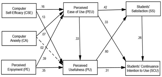 Continuing intention to use ICT refers to an individual’s ability to use and continue using ICT. SCU ICT is a factor that influences how people use technology [67,68]. The intention of students to use ICT in this study was their desire to use ICT to improve their learning satisfaction. Learning with ICT is a main component of developmental technology usage models [39,55]. In the literature on technology adoption, the phrase “intention to use” refers to a person’s willingness to put technology to use in the near future. Because of its accuracy in forecasting real technology use, in this analysis, it was used as an outcome variable [56].