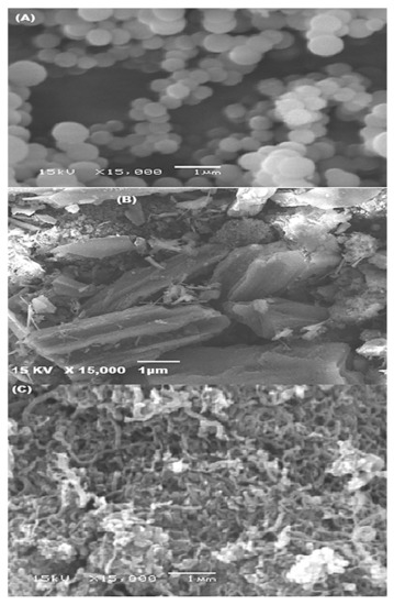 SEM images of P (AN-co-St) (A), P (AN-co-ST)/AC (B), and prepared MWCNTs (C).