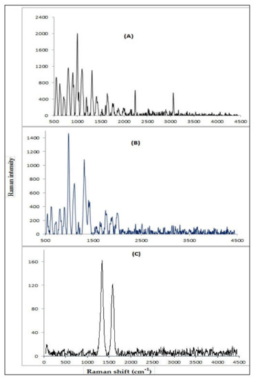 Raman analysis of P (AN-co-St) (A), P (AN-co-St)/AC (B), and MWCNTs (C).