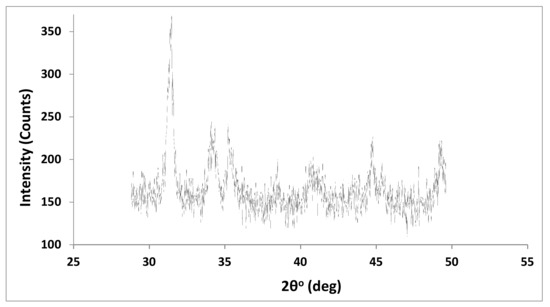 From the XRD pattern of the MWCNT sample displayed in Figure 5, we can conclude that there are strong bands at 2θ at 27.9, 31.28, 34.06, and 44.66° for the oxidized MWCNTs. This could be due to (002) and (100) planes of cleaned MWCNTs (graphite structure) providing improved crystallinity and a decline in the amorphous structure as a result of acid treatment [36].