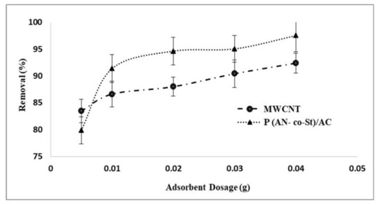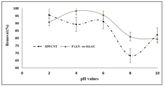 The pH of the aqueous solution is a significant factor that influences the dye adsorption process by changing the ionization conduct of adsorbent [39,40] and dye in addition to surface charge of the adsorbent. The efficiency of both MWCNTs and P (AN-co-St)/AC composites on RR35 uptake at various pH levels is presented in Figure 6. It can be seen that reactive red 35 dye elimination efficiencies increased with an increase in pH scope of 2–6, and that there was no increase in adsorption beyond this pH range. The maximum removal was achieved at pH levels of 2 and 4 with removal percentages of 95.57 and 98.41% for both MWCNTs and P (AN-co-St)/AC composites, respectively. This is due to the fact that the sorption capacity is highly pH dependent and because the adsorption mechanism relies upon the adsorbent surface charge and the ions of RR35 species in the solution. It can be noted that at a low value of pH, the binding capacity of the RR35 dye increased due to the anionic characteristics of the dye [41]. In addition, the surfaces of the MWCNTs display an anionic group (COO−) and subsequently improve their particle exchange properties for particular treatments of oppositely charged species (dyes) from aqueous mixture via the electrostatic power of their interaction [42]. In the acidic condition (pH = 2 and 6), electrostatic attraction between the surface of poly multiwalled carbon nanotubes and dye particles [12] causes effective adsorption of RR35. Machado et al. [33] examined the adsorption of reactive red M-2BE dye on carbon nanotubes and activated carbon, and the removal of this dye was achieved at pH 2. Additionally, Konicki et al. [43] found that at acidic pH conditions, a positively charged external sites on MMWCNTs-ICN favor the sorption of dye anions owing to the electrostatic attraction, and the pH of the dye solution augments, the number of positively charged sites on MMWCNTs-ICN adsorbent decreases, and the number of negatively charged sites increases.