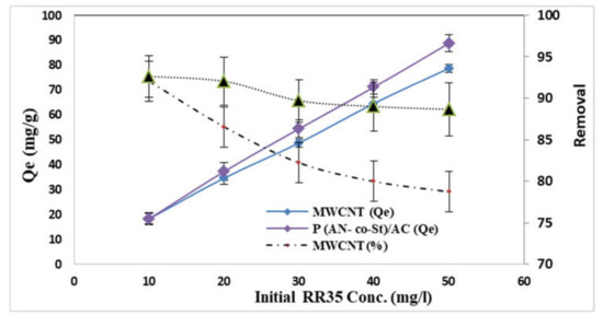 The influence of the various initial dye concentrations on RR35 dye uptake by MWCNT and P (AN-co-St)/AC composites was examined at various concentrations (10–50 mg L−1). From the achieved results presented in Figure 8, it can be observed that the removal of RR35 from two compounds is dependent on the initial dye concentration, increasing with a decrease in this concentration and decreasing at a higher initial concentration. The results showed that the amount of dye adsorbed per unit mass of adsorbent increased from 18.30 to 78.73 mg g−1 for MWCNT, while for P (AN-co-St)/AC, it rose from 18.26 to 88.75 mg g−1 by increasing the initial dye concentration from 10 to 50 mg L−1. This is in agreement with results reported by other studies [41,43,45,46]. Additionally, the data showed that the increase at the initial dye concentration improves the quantity of RR35 dye adsorbed onto the compounds. The increase in the adsorption capacity is possibly owing to greater interaction among the dye and adsorbent in addition to an increase in the number of dye particle collisions that increase the driving force of the concentration gradient with the increase in the initial concentration to overcome all resistances of the dye mass transfer among the solid phases and liquid [47,48]. Moreover, the higher amount of dye adsorption at higher concentrations is probably because of increased diffusion and decreased resistance to dye uptake [49]. As well as this, the maximum removal percentage was achieved at an initial concentration of 10 mg L−1, with removal percentages of 92 and 92.6% for both MWCNT and P (AN-co-St)/AC adsorbents, respectively. This can be explained by the fact that in RR35 adsorption process, dye concentration molecules first encounter the boundary layer effect; following this, they must diffuse from the boundary layer film onto the adsorbent surface; finally, they must diffuse into the porous structure of the adsorbent. Notwithstanding, the increase in the concentration of dye results in a reduction in the early rate of outside diffusion and expansion in the intraparticle diffusion rate [26].