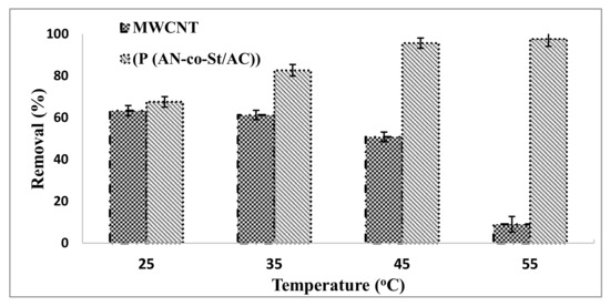 The influence of temperature on the adsorptions of RR35 onto MWCNTs and P (AN-co-St)/AC was examined at 25, 35, 45, and 55 °C, while keeping other parameters constant for the removal of RR35 dye, as shown in Figure 10. This figure demonstrates that the adsorption process of RR35 by MWCNTs decreased with increasing temperature from 25 °C (63.33%) to 55 °C (9.07%), indicating that the processes are exothermic. Because the adsorptive powers among adsorbate and active sites on the adsorbent became weak with the increase in temperature, dye removal efficiency decreased [52]. The adsorption of the P(AN-co-St)/AC adsorbent increased with the increase in temperature of the mixture from 25 °C (67.55%) to 55 °C (97.61%). This is due to expanded surface coverage and because the sites were made reactive and active. Higher temperatures accelerate the reaction rate and diminish the molecule thickness, which forms voids, resulting in a decreased equilibrium time [15].