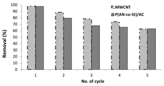 Regeneration of adsorbent composites is of economic importance. This experiment involved of numerous sorption–desorption cycles to estimate the impact of repeated decoloring on the sorption efficiency of the nanomaterials. It was found that the removal efficiency of RR35 by MWCNT and P (AN-co-St)/AC slightly changed, as shown in Figure 11. The data show that there is a difference between the original MWCNT and P (AN-co-St)/AC compared with reused nanocompounds at different initial RR35 dye concentrations. The extent of RR35 uptake reached to 98.18% after the first cycles then reduced to 62.72% after the five rounds of MWCNTs, while for P (AN-co-St)/AC the initial removal efficiency was 97.72% at 20 mg L−1, after the first cycle, which reduced to 63.18% after the five rounds signifying its validity for regeneration as shown in Figure 11. Hence, it could be concluded that the adsorption process by MWCNTs and P (AN-co-St)/AC stays affected with extended reused cycles without losing much of its dye-adsorption capacities. As a result, two nanocompounds were utilized on a number of occasions for the removal of RR35 dye from the aqueous stage. Therefore, this suggests that they can be used more than one time, demonstrating their economic viability.