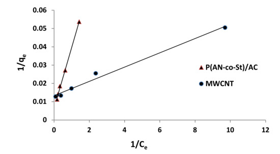 Figure 9 shows the influence of adsorption time by utilizing MWCNT and P (AN-co-St)/AC compounds containing 0.01 g of adsorbents. From the plot, we note that the elimination of color of RR35 increased sharply in the initial 5 min and then increased slowly until it reached removal levels in a period of 1 h in the case of MWCNT and P (AN-co-St)/AC. Adsorption time increased from 59.54 to 84.30% and augmented from 19.48 to 89.53% with an increase in contact time from 5 to 60 min for both MWCNT and P (AN-co-St)/AC, respectively. In addition, beyond the attained, almost constant value, there was no notable increase in color removal. This is because the adsorbent has limited adsorbent sites, and, after a certain time, these are exhausted and the adsorption process attains an equilibrium state [50]. In addition, it is also a consequence of the development of monolayer coverage on the external surface of the adsorbent [51]. The slow rate of RR35 sorption after the first one hour possibly arose owing to the slow pore diffusion of ions of the solute into the majority of the sorbent [10].