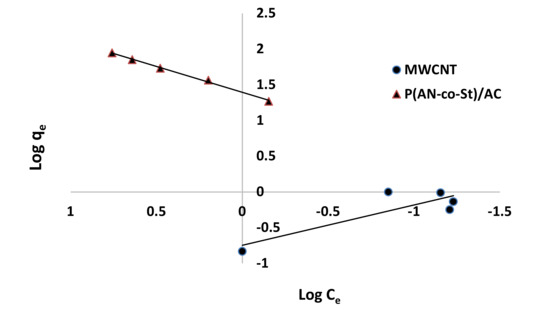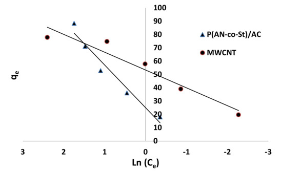 The maximum capacity qmax (monolayer) acquired from the Langmuir equation was 256.41 and 30.30 mg g−1 for MWCNT and P (AN-co-St)/AC, respectively. The obtained data show that the linear correlation coefficients (R2) of the Freundlich, Langmuir, Tempkin, and Halsey models fit well with the investigational information for P (AN-co-St)/AC, while the models of Langmuir and Tempkin fit well with the experimental results for MWCNT. Moreover, the Freundlich and Halsey isotherm equation is not compatible with the sorption method, as the linear correlation coefficient (R2) is below 0.90 for MWCNT. Favorable RR35 uptakes were established because the separation factor RL values fell within the range of from 0 to 1, with calculated values of RL of 0.008 and 0.841 for MWCNT and P (AN-co-St)/AC, respectively. Furthermore, a strong bond exists between RR35 MWCNT and P (AN-co-St)/AC adsorbents as indicated by the value of 1/n, which is named the heterogeneity parameter, describing the deviation from the linearity of sorption as follows: where 1/n is equivalent to 1, the adsorption is linear, and the dye particle concentration does not influence the division between the two stages. When 1/n is below 1, chemical adsorption occurs, and this demonstrates an ordinary Langmuir isotherm; however, when 1/n is more than 1, cooperative adsorption occurs, and this adsorption is more favorable physically and includes strong interactions among the particles of the adsorbate [54]. In the present study, the values of parameter “1/n” are less than 1; the data show a chemical adsorption process on a surface with this model to be favorable.