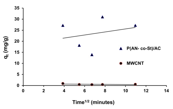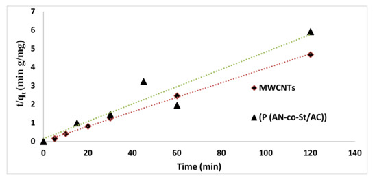 Table 6 exhibits the fitting data for the three kinetic equations. The determined adsorption capacity qe (cal) from the PFO equation differs fundamentally from investigational values (qe exp). The linear correlation coefficients and R2 values were not shut to 1; this infers that the PFO equation was not appropriate to expose the adsorption mechanism of RR35 to the composite adsorbents. On the other hand, from Table 7, it can be seen that the PSO kinetic equations fitted considerably well with the investigational data. The correlation coefficient values are near unity, demonstrating good agreement. In addition, the predicted (qe cal) values are near the corresponding experimental values (qe exp). Hence, the PSO equation fit well with the RR35 adsorption process by MWCNTs and P(AN-co-AS)/AC (Figure 16 and Figure 17). The intraparticle diffusion model provided low fit according to R2 values, for P (AN-co-AS)/AC and MWCNTs [58].