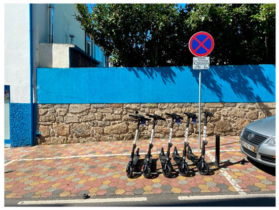 The e-scooter sharing system started its operation in Braga on 19 August of 2019 with only one company providing the service. The former Circ (now Bird) started its operation with about 80 e-scooters distributed around the city center with expected expansion in the short term. In the following months of the same year, two other companies started to provide the same service; Hive and Frog. These e-scooters from the 3 companies were available in 22 different parking spaces allocated within the city center area [83]. These parking spots were converted from car parking spaces to accommodate bicycles and e-scooters (Figure 1), which contributes to a more efficient public space usage once the same space that only accommodated one car now can contain at least 10 different e-scooters.