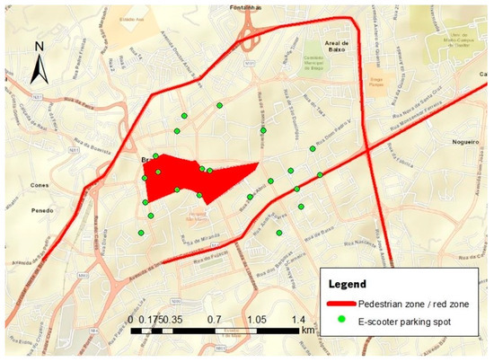 Although riders do not need to park their shared e-scooters in the parking spots, it is considered a great asset to decrease the number of e-scooters parked on sidewalks blocking the walkways. Besides the parking spots, the City of Braga also created a “red zone”—that can be seen in the company app—where the maximum speed of the e-scooter must be reduced, and the wheels are blocked when the rider reaches a “no-circulation zone”. These areas were created to increase the safety of the e-scooter user and the pedestrians circulating in the area. This “no-circulation” zone covers some important streets of the city, such as Dom Diogo de Sousa Street, Souto street, Dom Paio Mendes Street, Dom Gonçalo Pereira Street, Rossio da Sé, Misericórdia Street, Eça de Queirós Street, Dr. Justino Cuz Street, Francisco Sanches Street, Janes Street, S. Marcos Street, Liberdade Avenue, and Dr. Gonçalo Sampaio Street. The map in Figure 2 covers the city of Braga with the “red zones” printed in “red” and the 22 e-scooter parking sport in green.