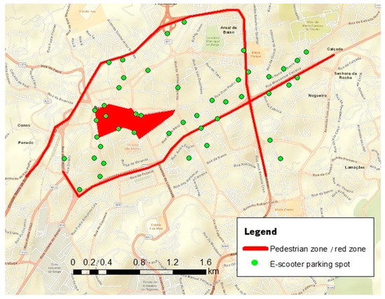 In addition, to boost e-scooter usage by young adults that attend the University of Minho and high schools within the central area o Braga, more parking spots were created to allocate the 500 e-scooters that were available (Figure 4).
