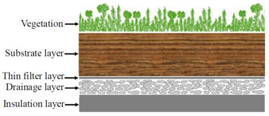 The green roof classification is dependent on its thickness and its weight. Among nature-based solutions for roofing systems, the extensive green roof has the shallowest depth and the lightest weight and it includes vegetation, substrate, filter, drainage and insulation layers, from top to the bottom [14,15]. The physical properties of materials used for the substrate and drainage layers can noticeably influence the permeability and thermal performance of roofing systems [16]. Furthermore, high porosity of substrate layer can contribute to promoting the insulation performance of a green roof [17]. Moreover, the green roof’s heat resistance is affected by the moisture content of substrate layer in which the media mixtures can be used in wet and dry states [8,18]. Concerning this, a study by Kotsiris et al. [19] on green roof systems showed that there was a linear relation between the substrate’s thermal conductivity and its moisture content, even though this linear assumption seemed to not be realistic as reported by other researchers [20,21,22,23]. The moisture content effect on the green roof performance during dry periods was evaluated by Berretta et al. [24]. The vertical profile of the moisture content was highly dependent on the substrate’s characteristics. Moreover, the diurnal temperature fluctuation led to a daily reduction in moisture content owing to evapotranspiration during the warmer hours of the day. A study by He et al. [25] on green roof thermal behavior showed that increasing the evapotranspiration phenomenon increased with the presence of water content in the substrate layer during the summer period, contributing to promoting the green roof’s thermal performance due to increasing the evaporated water. Pianella et al. [26] revealed that the media mixtures used for substrate layer influenced the green roof’s thermal conductivity. In addition, increasing the media mixtures’ moisture content led to increasing the substrate layer’s thermal conductivity; hence, the green roof with a dry substrate had the lowest thermal conductivity. Fabisni et al. [27] showed that the water content noticeably affected the substrate and drainage layers’ thermal properties, in which the thermal conductivity of substrate increased by triple during the raining periods. Another study by Almeida et al. [28] on green roof’s thermal behavior demonstrated that the presence of a substrate layer increased the thermal insulation of green roof systems, while its insulation capacity in wet state was not as much as that in dry state. Recently, He et al. [29] showed that the green roof’s cooling effect increased by increasing the substrate’ water content. Moreover, the cooling and heating loads of buildings decreased once the green roof was used for the rooftops.