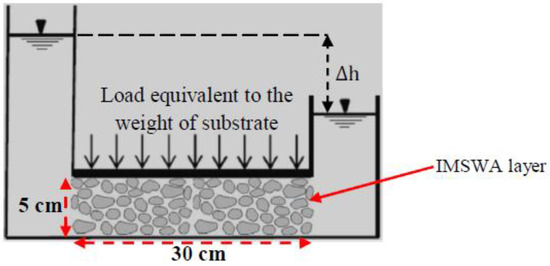 To assess the horizontal water passing ability of the IMSWA layer, the transmissivity test apparatus was used and carried out according to ASTM D4716 [56]. A cross-sectional view of the transmissivity test is shown in Figure 3, in which was the difference in total head across the IMSWA layer. The load equivalent to the weight of substrate was used to apply to the top of IMSWA layer. Additionally, to prevent the water coming up from the sides of the load cell, a foam was used at its bottom. After following a high amount of water using the hose-pipe, the water horizontally passed through the IMSWA layer in less than one second, then the water surface was observed to have the same level at the two sides of the U-shape box apparatus, resulting in zero value for parameter. Consequently, the drainage layer of IMSWA with a size of 7 mm was able to horizontally pass a high amount of water for the green roof systems, contributing to buffering the storm water runoff.