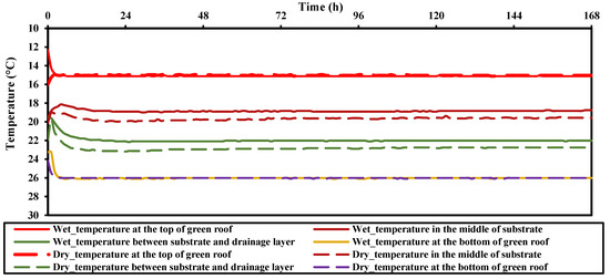 According to the experimental process, the applied temperature to the top of green roof specimens (15 °C) was lower than that to the bottom of green roof specimens (26 °C); hence, the temperature applied by the thermal device to the green roof specimens was representative of a cold period. Therefore, the effect of the dry and wet states of the substrate layer on the temperature distribution across the green roof systems (S15-IMSWA5_Wet and S15-IMSWA5_Dry) was assessed as shown in Figure 4.