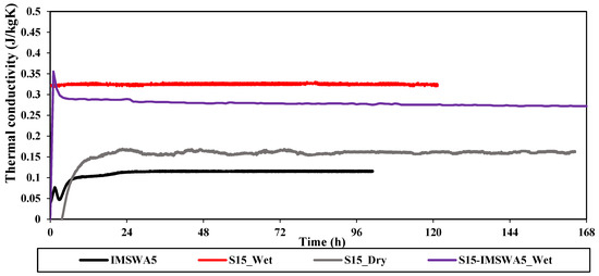 As presented in Table 2, the Rc-value of the dry substrate layer, S15_Dry, (0.94 m2 K/W) was about twice that of IMSWA5 as the drainage layer (0.43 m2 K/W), while the thickness of the former was three times that of the latter. It seems that the air-spaces among IMSWAs effectively participated in increasing the drainage layer’s thermal resistance. In addition, assuming the same thickness for IMSWA and dry substrate layers, the air-spaces among IMSWAs were found to be more than those among dry substrate’s particles. In fact, the heat could not flow more easily across air-spaces as much as solid particles. Therefore, when the particles were tighter and compressed more, the contact points among particles increased, leading to facilitating the conduction heat transfer through substrate layers, similar to what other researchers revealed [26,64,65,66,67]. On the other hand, there was no significant difference between the Rc-value of the unsaturated substrate layer (S15_Wet) and IMSWA5, while the thickness of the former was three times that of the latter. It can be said that the air-spaces in IMSWA5 were more than those in the unsaturated substrate layer, and the presence of the water content in the latter provided the same heat resistance as the drainage layer of IMSWA5, while the thickness of the substrate layer was three times that of the drainage layer.