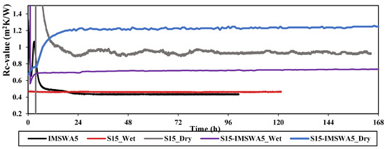 The effect of the unsaturated and dry substrate layer on the thermal resistance of green roof systems (S15-IMSWA5_Wet and S15-IMSWA5_Dry) was assessed. As presented in Table 2, the Rc-value of green roof system with dry substrate (1.26 m2 K/W) was 1.7 times more than that of the green roof system with the unsaturated substrate (0.735 m2 K/W), while the reverse was obtained for the thermal conductivity. In brief, an increase in thermal resistance of green roof systems can be a consequence of the increase of air-spaces among dry soil particles, outperforming the water content in the unsaturated soil particles. That is why the insulation performance of green roof systems was found to be adequate during the summer (warm) period, while, in some cases, the thermal resistance of roofing systems with the unsaturated substrate was less favorable during the winter (cold) period as reported by other researchers [8,12,40,68].