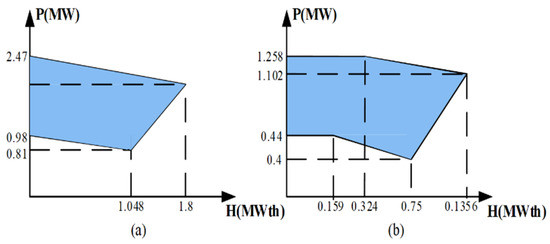 CHP units simultaneously generate electricity and heat. It means that the electricity and heat generated by the CHP units are interdependent and they cannot be controlled individually. There are two types of feasible operation regions (FOR) for CHP units [28]. Two FOR types are shown in Figure 1. FOR type I (Figure 1a) can be modeled linearly. Equations (34)–(38) describe FOR type I in the scheduling problem of this grid [28]: