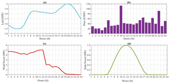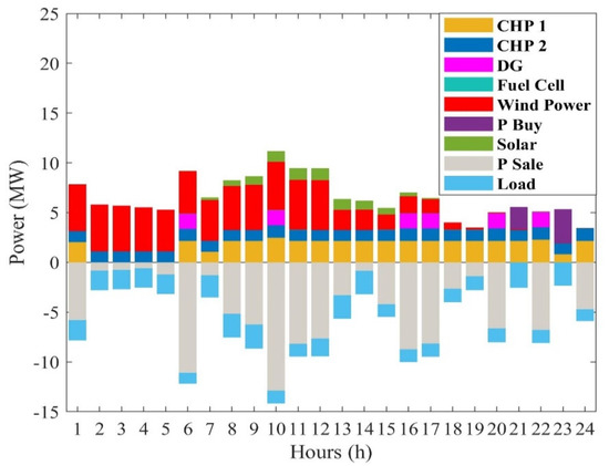 The penetration level of the DRP is considered to be 30% (). The specifications of the battery and the heat storage unit are presented in Table 1 and Table 2, respectively [6]. The start up and shut down costs of the various units are given in Table 3 [6]. Additionally, the cost functions of the boiler, the conventional power generation unit, the fuel cell unit, and the CHP units are expressed in Equations (74)–(78), respectively [6].