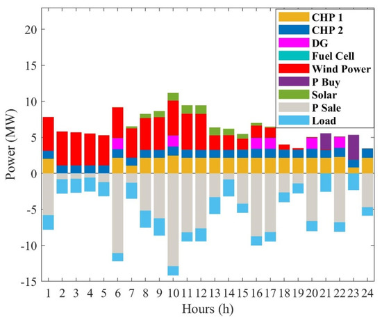 According to the following constraint, the total power generated by the units at each hour, the power discharged from the battery, and the power purchased from the market (i.e., ) is equal to the total charged power of the battery, the power sold to the market (i.e., ), and demand (after applying the DRP):
