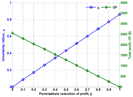 is the critical value of objective function (or the maximum permitted value of the reduction of the objective function relative to the base value), which is preset by the decision maker. According to Equation (13), this value is considered as a function of the base-case value of the objective function. is the uncertainty radius of the uncertain parameters of the problem, which is a positive variable. In Equation (13), is the tolerable reduction of the objective function with respect to its base-case value due to undesirable uncertainties. The value of is preset by the decision maker. In the model presented by (9)–(15), the maximum uncertainty radius is determined in such a way that the value of the objective function is not reduced from the allowed range specified in Equation (12) for the changes of uncertain parameters in accordance with Equation (14).