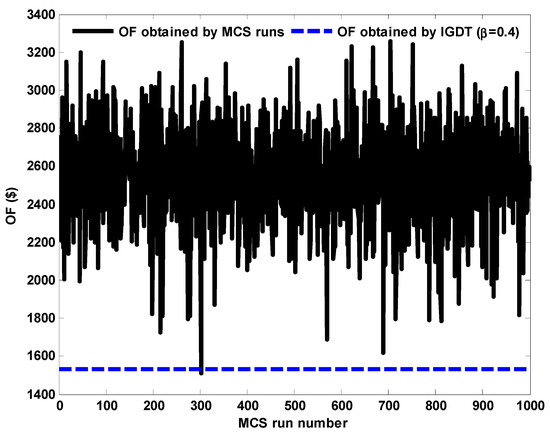 In Equation (67), OFb is the net daily revenue in the base case in which the uncertain parameters are exactly equal to the corresponding predicted value. and are respectively the average power generation values of wind turbines and solar farms. Equation (68) also implies that all Equations (23)–(66) should be considered simultaneously.