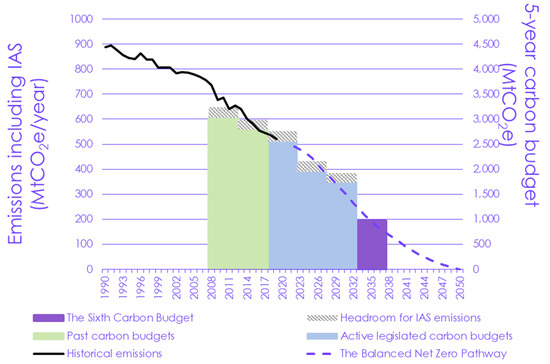 This paper is based on an analysis of the United Kingdom (UK). The UK government has set a UK-wide target under the Climate Change Act 2008 and Climate Change Act 2008 (2050 Target Amendment). The latest amendment, ratified in 2019, adds a commitment to cutting emissions by 100% by 2050 (from 1990 levels), with a series of five-year budget periods set along the route. Previous research has shown that the presence of ambitious targets (80% reductions at that time) served as a ‘lodestar’ to point actors in a new direction but offered little in the way of structure to stimulate change [9]. However, a 100% reduction goal should change the nature of the debate from what is to be included in the emissions reduction goals to ‘by when?’ and ‘how?’ as all sectors are, de facto, critical. The policy position has now effectively moved beyond arguments about whether sectoral target setting is a good idea [10,11].