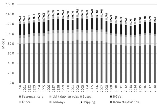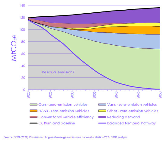 Globally, the transport sector comprises 24% of direct CO2 emissions from fuel combustion, and this has risen at a rate of 1.9% per annum since the year 2000 [30]. In the UK in 2019, transport comprised 27% of CO2 emissions (excluding international aviation and shipping) and, at 119.6 MtC, was only 4.6% lower than nearly 30 years ago in the baseline year of 1990 [15]. Transport’s importance to the overall emissions burden and trajectory are now so significant it can no longer lag behind the national trajectory.