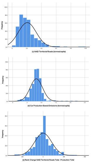 Both methodologies produced a very considerable spread of emissions performance at the most disaggregated spatial scale, although the distributions were highly skewed, with a larger concentration of lower bands. As the spatial scales of local government were aggregated, the differences between accounting methods diminished as expected because the larger scales of government would encompass more of the distance traveled and, therefore, the emissions (as per Figure 5). Large rank changes between the two methods are indicative of a mismatch between estimates, which were based on movement within an area and those which might be associated with residents of that area. At the lowest spatial scale (Figure 6e), we see a standard deviation of rank changes of 81; that is to say, a third of the authorities changed ranks by more than 81. As we move up the aggregation level, we see the rank shifting reduce considerably (Table 3). We accounted for the reduction in numbers of authorities considered at different levels of aggregation by using the standard error as our comparator.